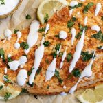 Serve the salmon with a spoonful of the lemon yogurt sauce and garnish with fresh herbs and lemon wedges.